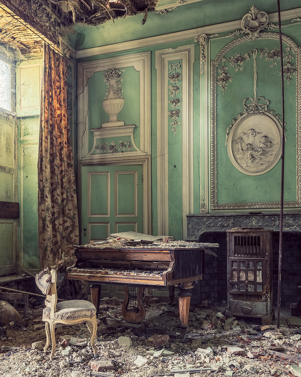 Wenn die britische Fotografin Gina Soden einen verlassenen Ort betritt, ist es immer die Stille, die sie zuerst beeindruckt. Dann kommen die rissigen Wände, zerbrochenen Fenster, abblätternde Farbe, staubigen Möbel und wild wucherndes Unkraut… Anstatt vor der Trostlosigkeit dieser Orte zu fliehen, die jeder verlassen zu haben scheint, macht Gina Soden sie zu ihrem Reich und ihrer Leinwand für künstlerischen Ausdruck. Sie sieht darin einen ästhetischen Reichtum und eine Erinnerung, die von der Zeit weggemeißelt wurde. Die Fotografin durchstreift Europa auf der Suche nach verwunschenen Schlössern, verfallenen Krankenhäusern, stillgelegten Fabriken und verlassenen Herrenhäusern. Ohne jemals ihren Standort preiszugeben, lässt sie sie in fotografischer Form wiederauferstehen.