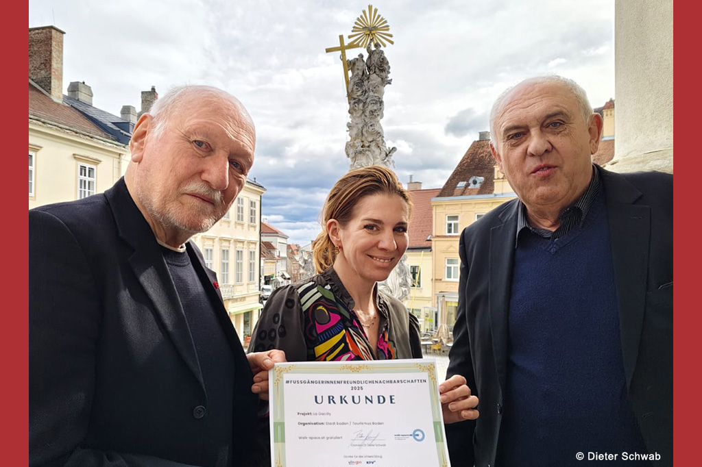 Und schon wieder gibt es Grund zur Freude für das Festival La Gacilly-Baden Photo und die Stadt Baden: Walk-space.at, der Österreichische Verein für Fußgänger:innnen – vertreten durch Obmann Dieter Schwab, hat an Frau Bürgermeisterin Carmen Jeitler-Cincelli und Festivaldirektor Lois Lammerhuber im Rathaus Baden eine ganz spezielle Auszeichnung übergeben.
